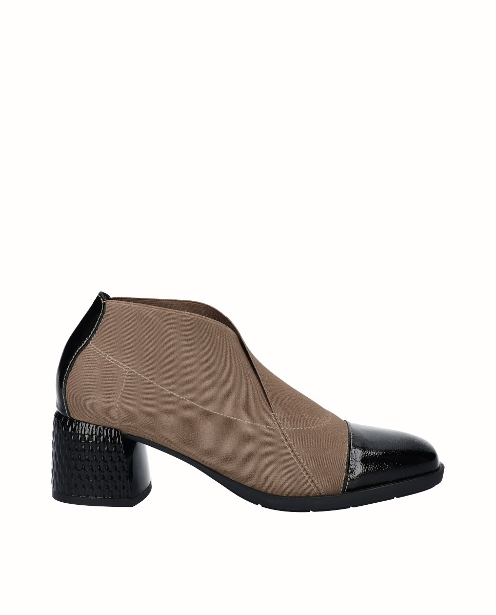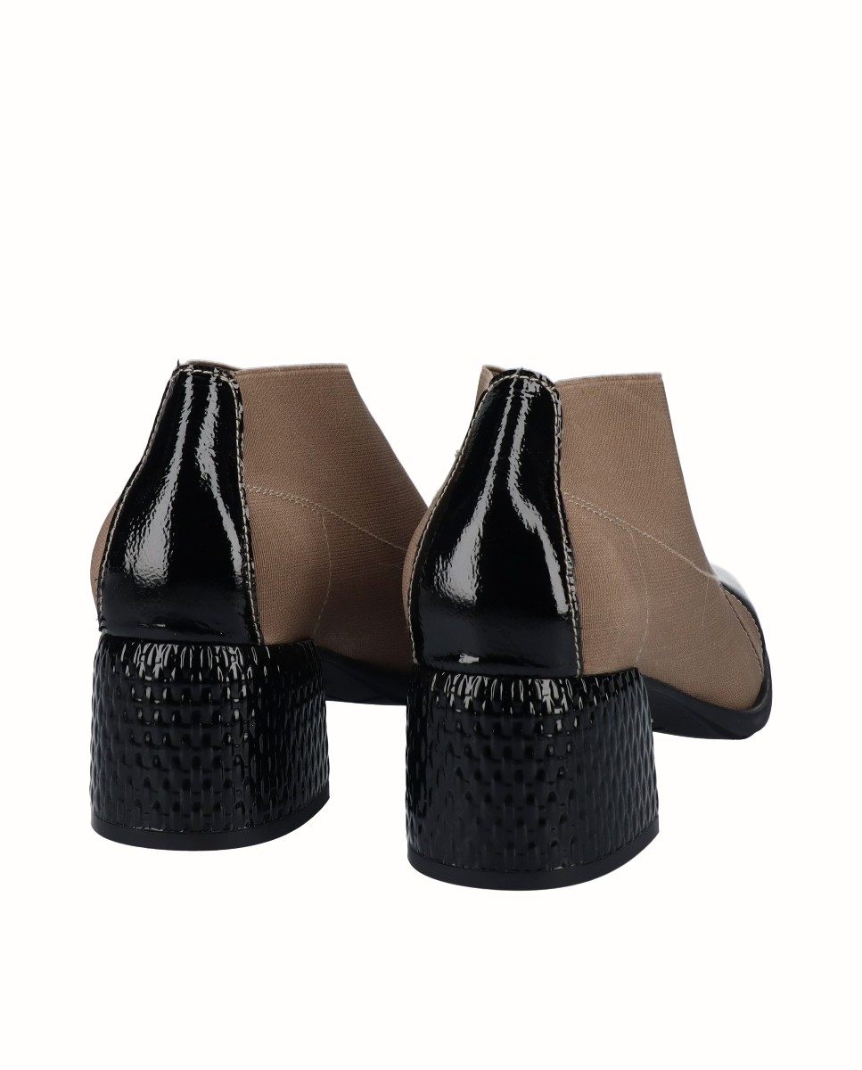 MOCASIN DE MUJER CHAROL NEGRO COMBINADO EN HIELO CON ADORNO DE UNOS REMACHES Y  CON TACON MEDIO