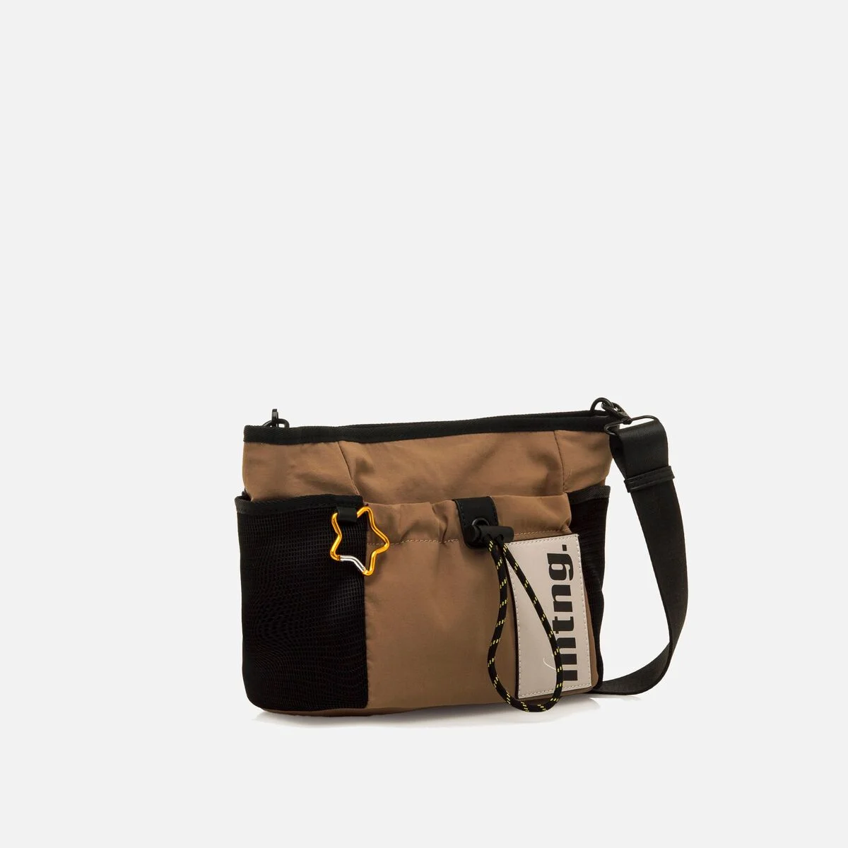 Bolso bandolera de color arena para mujer modelo Noca de Mustang, estilo urbano. Este bolso compacto de inspiración deportiva combina funcionalidad y estilo con detalles en negro y bolsillos de rejilla laterales. Incluye asa bandolera ajustable, cierre superior con cremallera, bolsillo frontal con cordón elástico y aplique de mosquetón en forma de estrella para un look casual y desenfadado. El logo frontal le da un acabado actual, ideal para llevar lo imprescindible en escapadas o actividades diarias con comodidad y un diseño diferente.