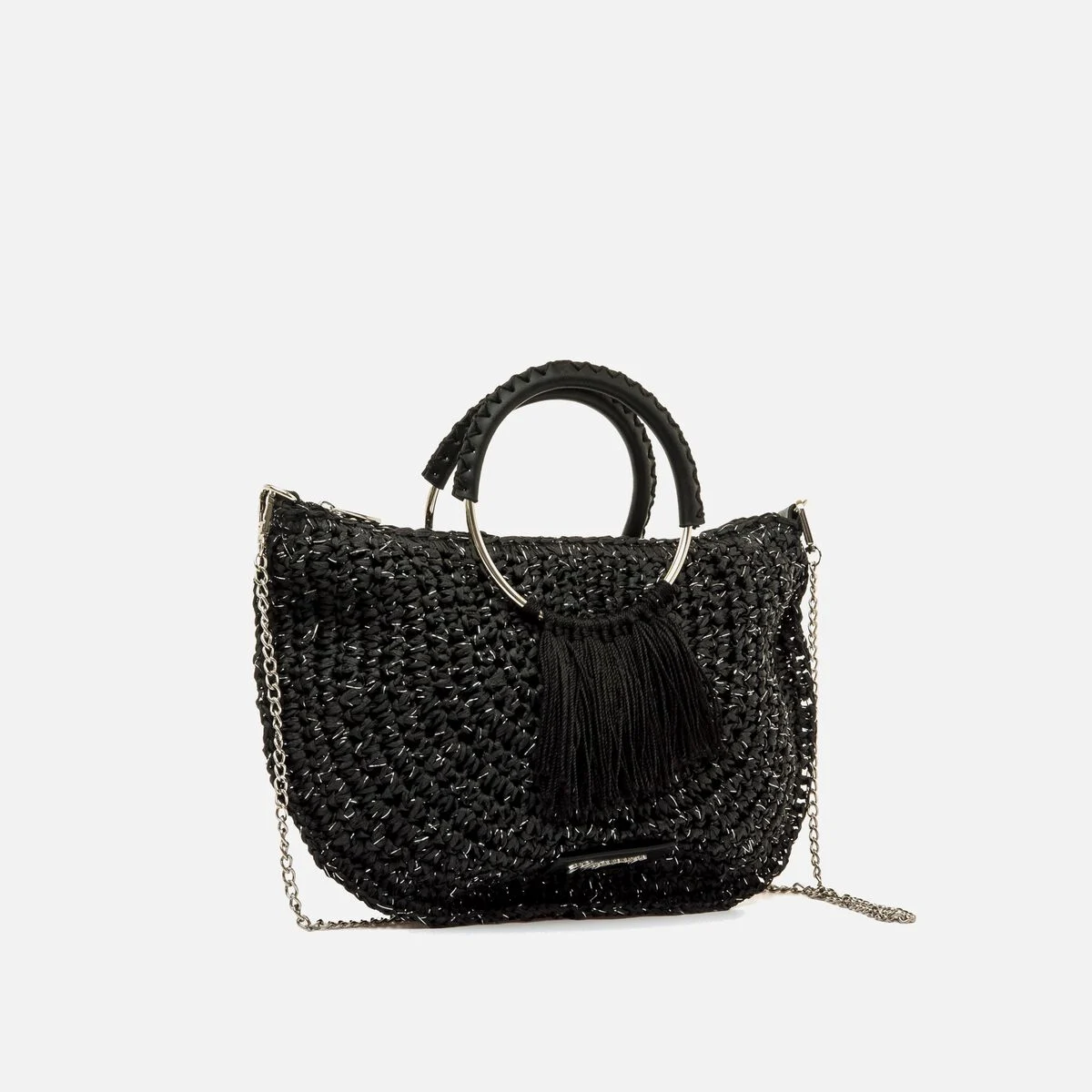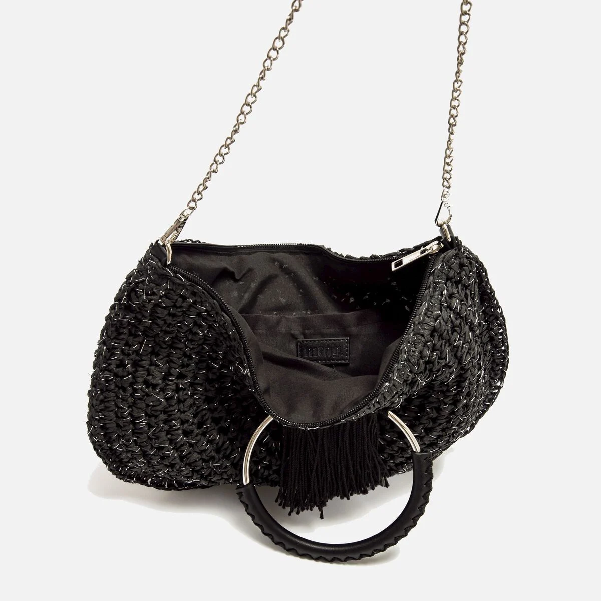 Bolso de mano de la marca Mariamare, modelo Tempo de color negro. Diseñado en rafia trenzada con hilo plateado brillante, su forma semicircular y estructura flexible le aportan un estilo veraniego con un toque elegante. Destaca por su borlón decorativo en la parte frontal y sus asas metálicas redondas, forradas en polipiel negra con detalle de costuras decorativas. Incluye cadena metálica plateada desmontable para llevarlo también al hombro o cruzado. Su interior está forrado y cuenta con cierre de cremallera. Un bolso versátil y sofisticado, ideal tanto para el día como para la noche.