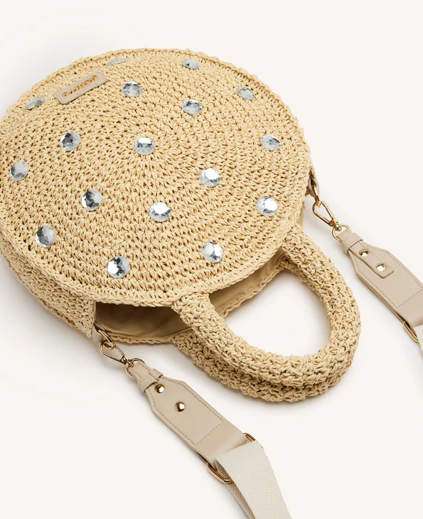 Bolso tipo bandolera de rafia con adorno de joyas.