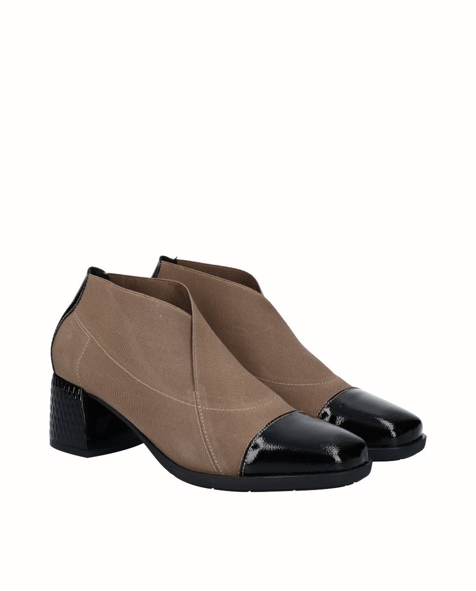 Zapato abotinado color taupe de licra con puntera, trasera y tacón en color negro y de charol DCHICAS 4734