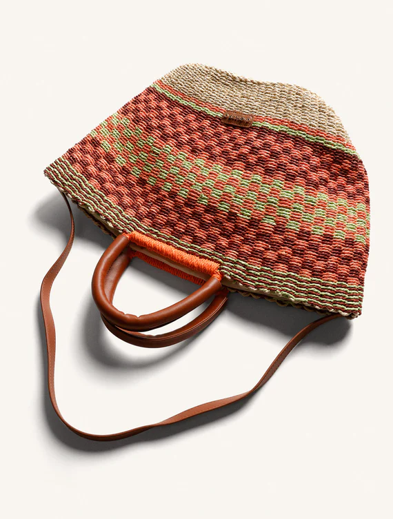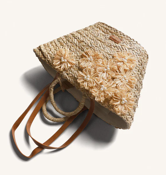 Bolso tipo capazo efecto rafia con detalle de flores.