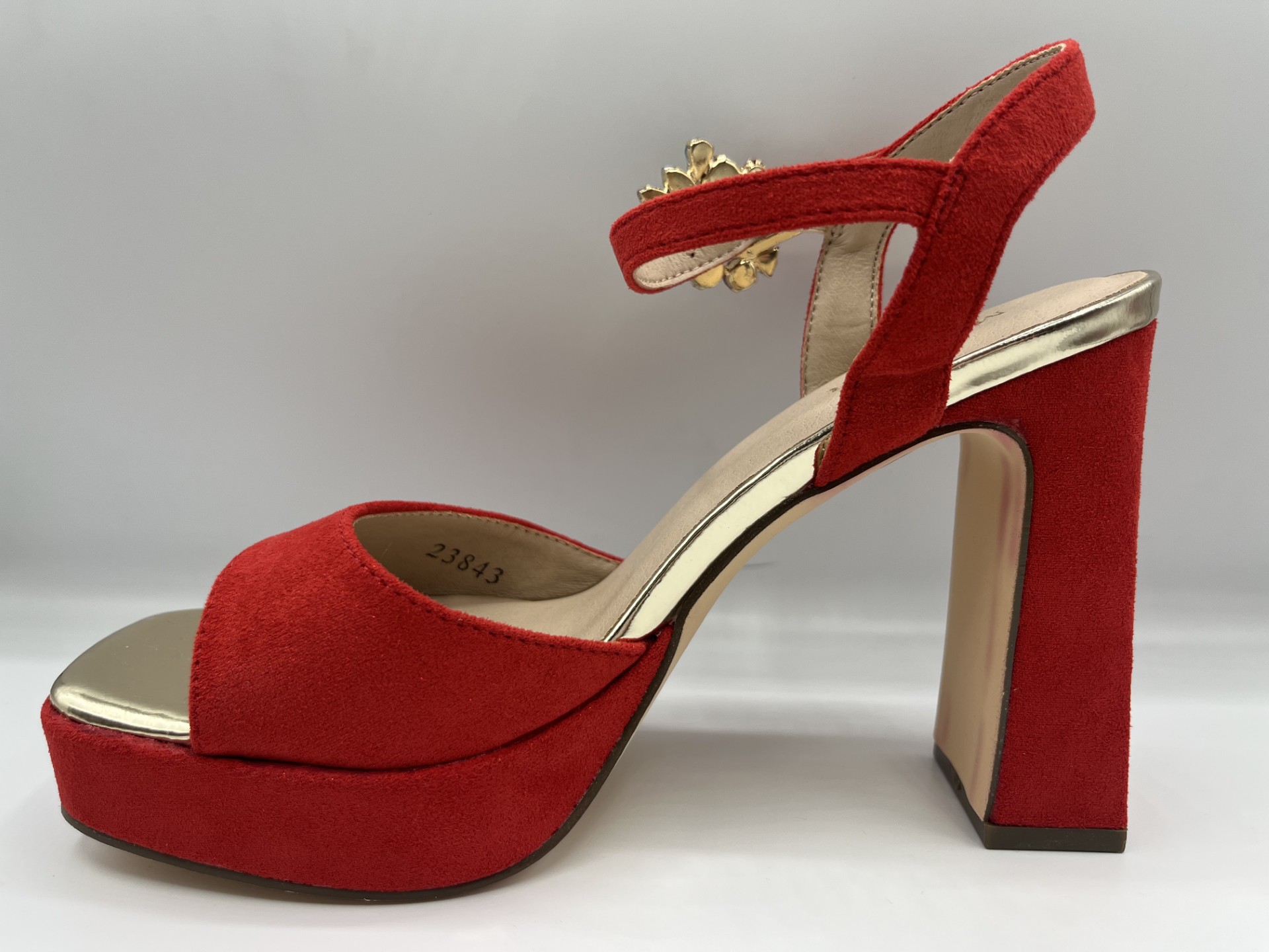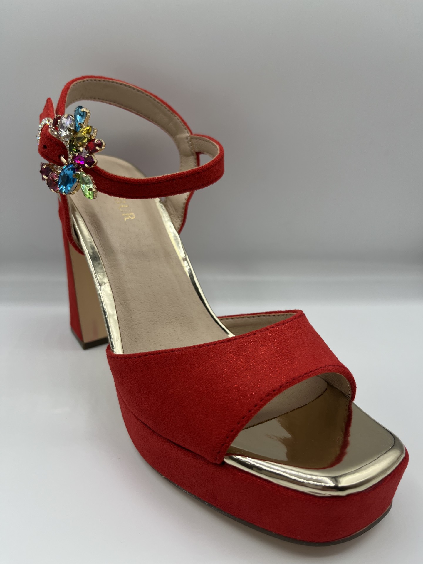 Sandalia color rojo de tacón alto y plataforma, con adornos de piedras de colores el el tobillo MENBUR 23843